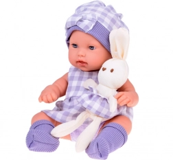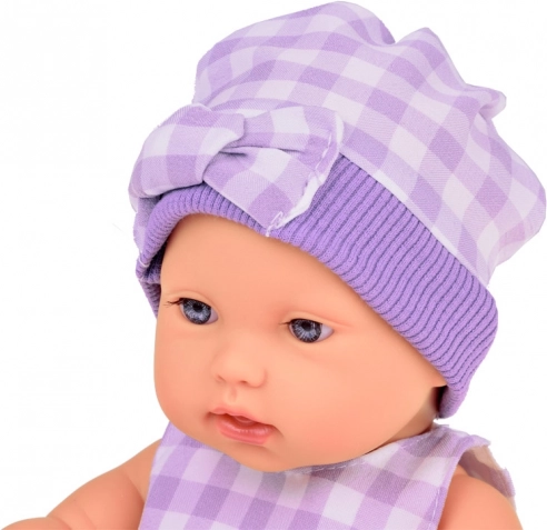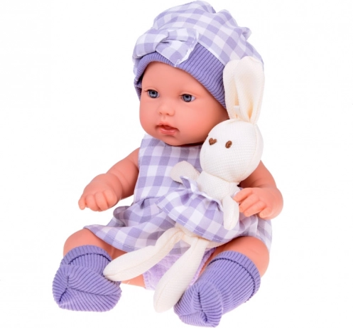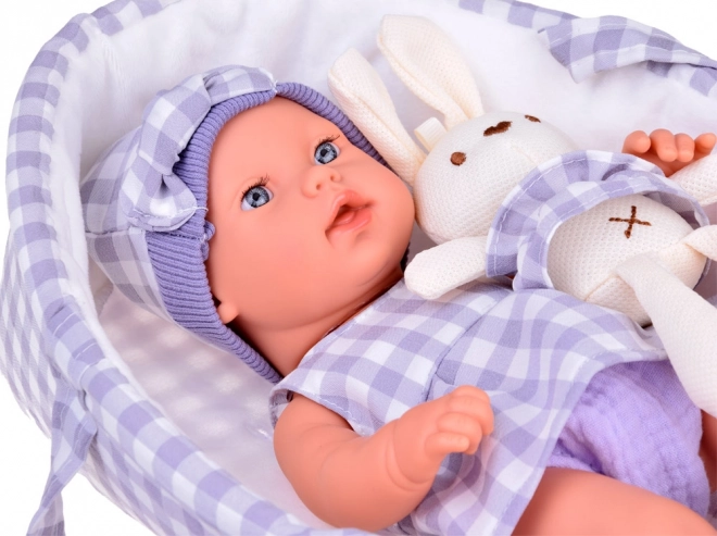 Setul este armonizat cromatic într-un gri elegant, cu model în carouri: păpușa poartă căciuliță, rochiță și șosete, iepurașul de pluș are fustiță în același stil, iar coșul textil completează frumos întregul. Datorită membrelor mobile, păpușa poate fi ușor așezată sau culcată, ceea ce extinde posibilitățile de joacă.