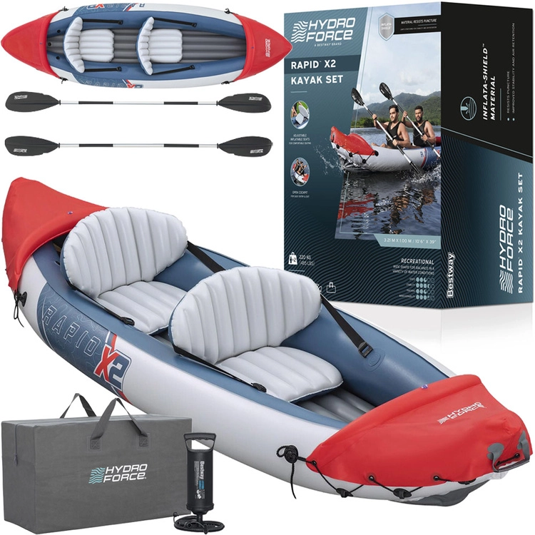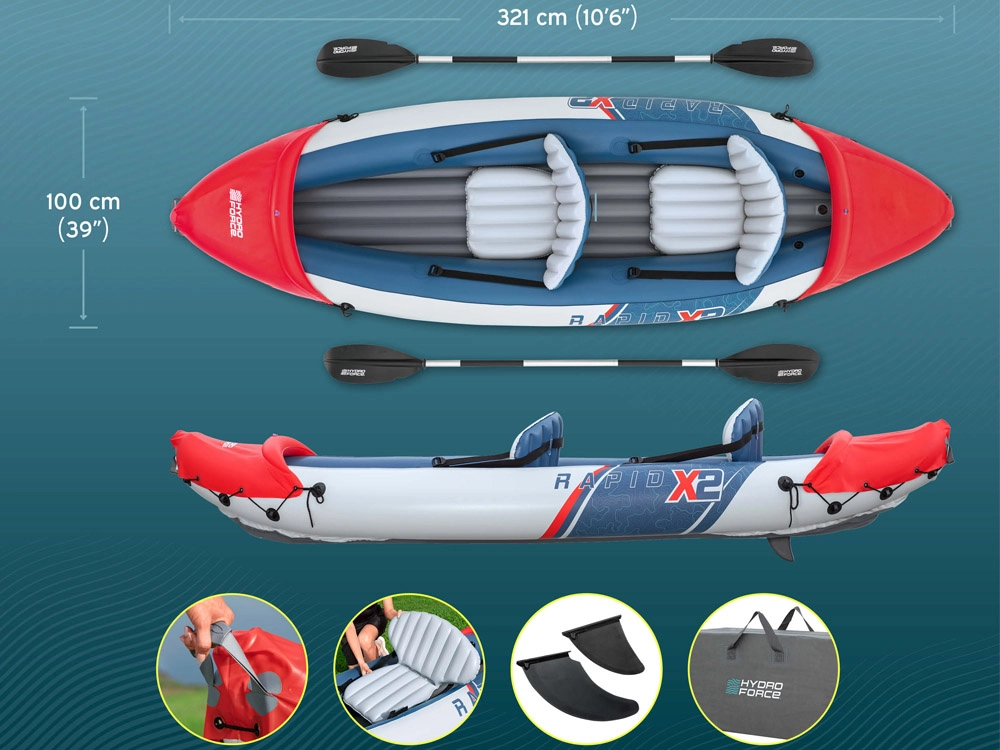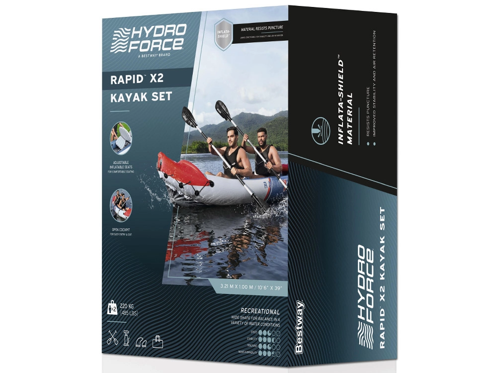 Plecați imediat după despachetare. Setul include două vâsle ușoare din aluminiu, o pompă manuală performantă și un petic de reparare.