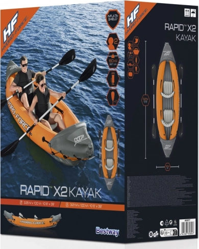 Hydro-Force Lite-Rapid X2 este un caiac cu o structură robustă, care datorită dimensiunilor de 321 x 88 cm poate găzdui cu ușurință două persoane. Caiacul este echipat cu scaune gonflabile cu spătare și o construcție I-beam pentru stabilitate și confort crescute. Valvele Boston asigură umflarea și dezumflarea rapidă. Caiacul este de asemenea echipat cu o aripioară detașabilă care îmbunătățește stabilitatea direcțională și manevrabilitatea. Fabricat din material PVC solid, caiacul rezistă cu ușurință la vânturile laterale și oferă o experiență plăcută de vâslit.