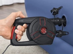 Această pompă electrică de la marca Bestway combină performanța puternică cu compatibilitatea versatilă. Este echipată cu trei valve universale, ceea ce o face ideală pentru diverse articole gonflabile, cum ar fi saltelele, jucăriile de piscină și altele. Cu un debit de aer de 1100 l/min, pompa asigură umflarea rapidă și poate fi comutată ușor pe modul de dezumflare pentru o depozitare facilă. Pompa este alimentată de la priza de uz casnic 220 V și atinge o presiune de 0,97 PSI, ceea ce o face potrivită chiar și pentru obiecte mai mari care necesită presiune mare.