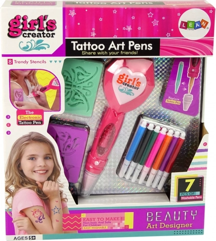 Descoperiți o distracție grozavă pentru copiii de la 5 ani în sus – setul pentru tatuaje temporare cu stilou electronic, care imită fidel funcționarea unei mașini de tatuat. Datorită markerelor speciale, tatuajele sunt sigure pentru piele și ușor de îndepărtat, astfel încât copiii se pot bucura de modele noi în fiecare zi.