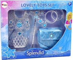 Acest set este proiectat special pentru fetițe, într-o nuanță pastel de albastru, decorat cu elemente sclipitoare și pietre strălucitoare. Alegerea perfectă pentru baluri de carnaval, petreceri aniversare, petreceri tematice sau stilizări zilnice acasă.