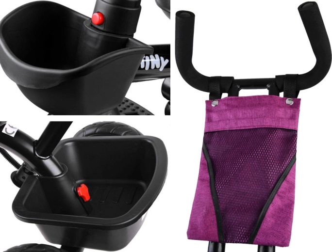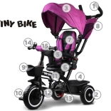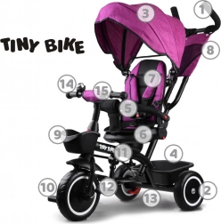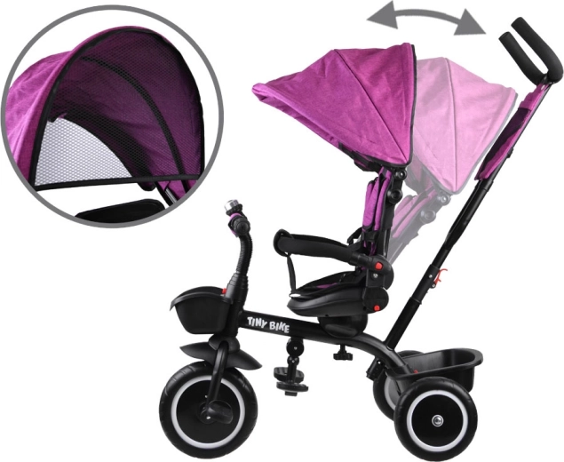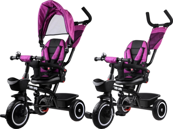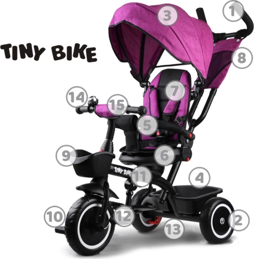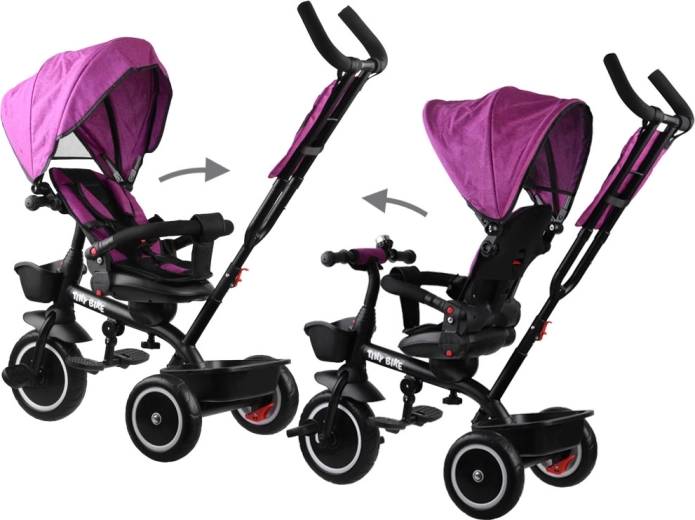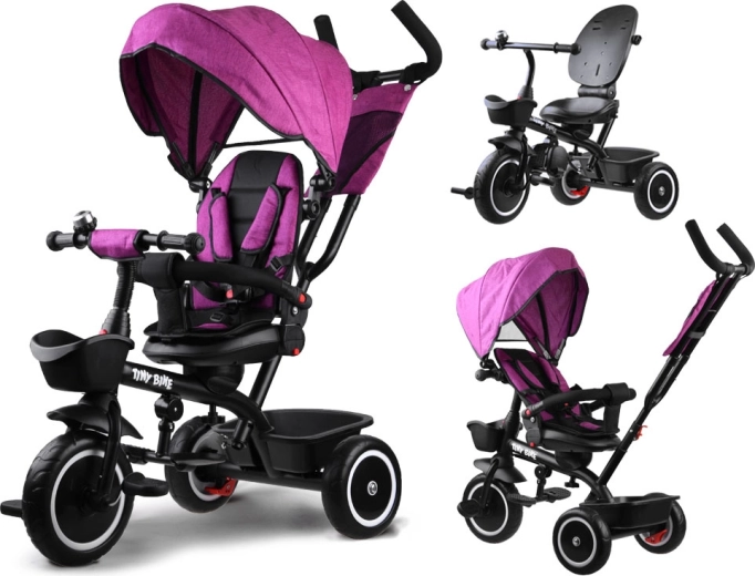 Tricicleta practică 3‑în‑1 TINY BIKE, cu scaun rotativ și copertină, crește odată cu copilul tău de la 6 luni până la 5 ani. Oferă confort, centuri în 5 puncte, copertină pliabilă cu plasă, direcție pentru părinte și roți EVA fără întreținere pentru plimbări sigure și line.
