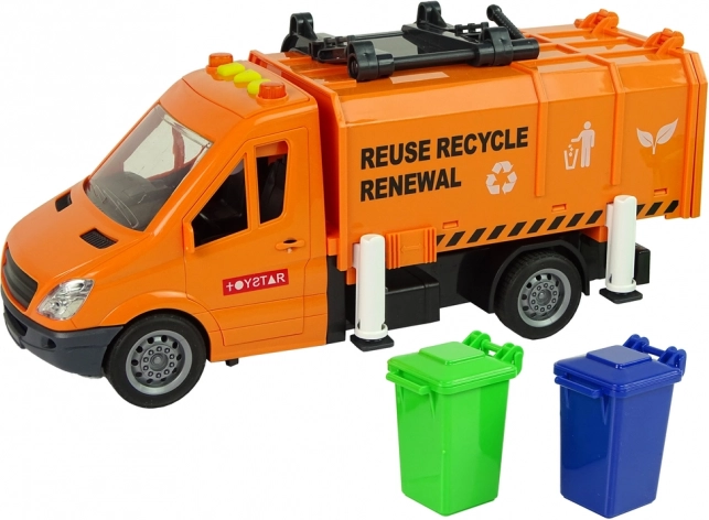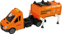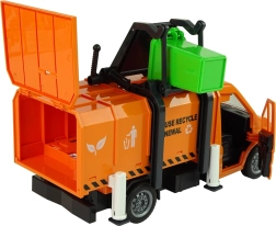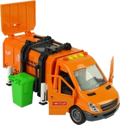 Camionul de gunoi portocaliu reproduce fidel un vehicul real de colectare a deșeurilor și transformă camera copilului într-un mic centru de reciclare. Datorită mecanismului cu fricțiune, este suficient să împingeți camionul pentru a porni singur. Containerul cu deschidere permite golirea ușoară a „deșeurilor”, în timp ce ridicătorul lateral varsă conținutul coșurilor direct în suprastructură.