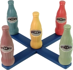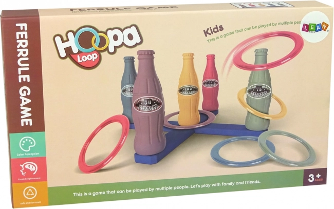 Acest joc clasic de aruncat, într-o variantă modernă, oferă reguli simple și multă distracție. Scopul este să arunci inelele astfel încât să ajungă pe sticlele colorate așezate pe baza în cruce. Fiecare sticlă are puncte atribuite, astfel încât poți crea ușor un joc competitiv pentru copii și adulți.