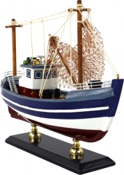 Acest model de navă de colecție este o piesă de artizanat excepțională. Este așezat pe picioare masive din lemn, ceea ce îi conferă eleganță și rafinament. Nava are o culoare albastru închis, completată de dungi albe, oferindu-i un aspect marinăresc clasic.