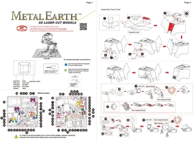 Scoateți piesele individuale din plăcuțele metalice; dacă este necesar, folosiți clești de tăiere mici (nu sunt incluși). Piesele se îmbină între ele prin încuietori formate dintr-un cârlig (lăbuță) și o fantă. Îndoiți cârligul cu ajutorul unor clești subțiri mici (nu sunt incluși) și îmbinați pe rând toate încuietorile până când obțineți o piesă de măiestrie foarte realistă!
