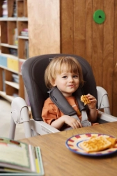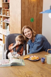 Scaunul de hrănire MoMi GOJO este echipat cu centuri de siguranță în 5 puncte, astfel încât copilul tău stă în siguranță, în timp ce tu îl ajuți liniștit să-și diversifice meniul.