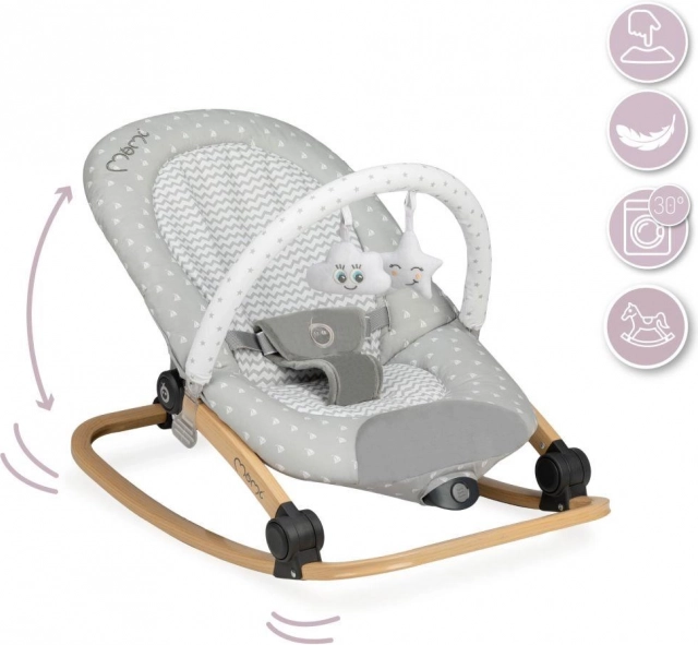Șezlongul vibratoare MoMi Lumiwood, confortabil și sigur, cu melodii, jucării și întreținere ușoară.