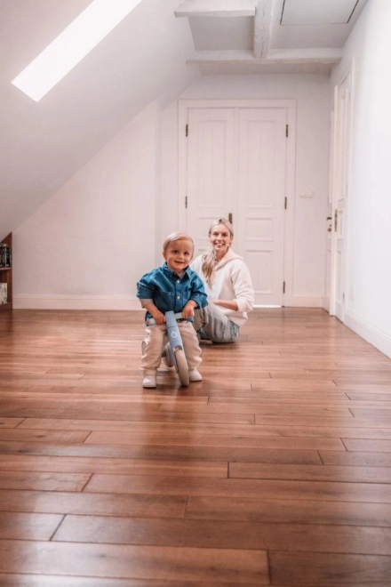 Vehiculul fără pedale MoMi TEDI este sigur pentru cei mici, având roți din spate largi care asigură stabilitate.