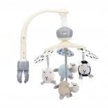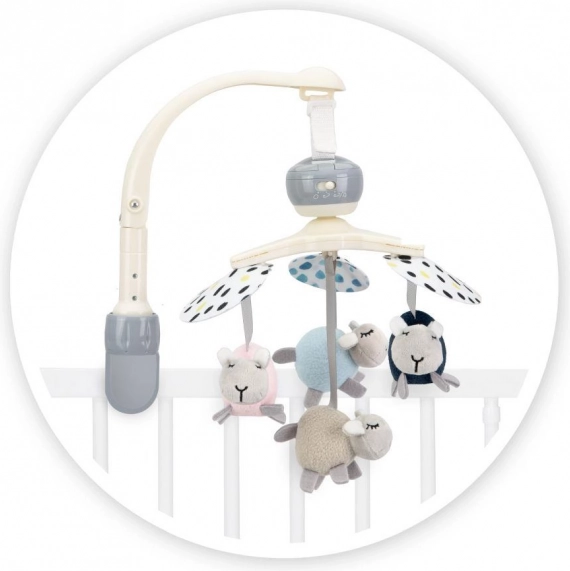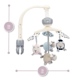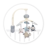 Sunt incluse jucării senzoriale moi din textile de calitate (catifea, pâslă) cu elemente foșnitoare și piuitoare. Jucăriile se detașează ușor și pot fi folosite separat sau spălate la mașină. Rotația lentă susține percepția vizuală și concentrarea bebelușului.