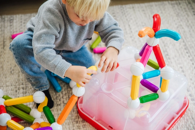 Containerul SmartMax care conține 100 de piese de construcție magnetice este ideal pentru realizarea unor construcții mari și frumoase. Această jucărie magnetică de construcție este ideală pentru copiii mici de la 1 an. Din acest set copiii vor construi clădiri superbe, poduri etc. De asemenea, este ideal pentru locuri de joacă pentru copii, grădinițe. Setul de construcție este depozitat într-un container practic. Capacul roșu și fundul containerului servesc, în același timp, ca plăci de bază pentru construcții.