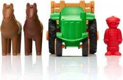 Setul conține un tractor și doi căluți, pe care copiii îi pot asambla după propriile imaginații. Figurina fermier adaugă distracție, stimulând jocul imaginativ și dezvoltarea abilităților sociale la copii. Cu culori vii și un design simplu, acest set de construcție este potrivit pentru mâinițe mici.
