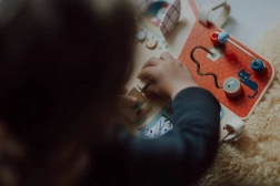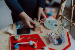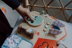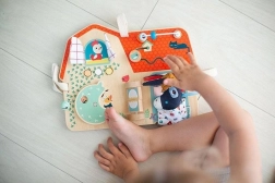 Tablă include un ecran zgomotos, butoane, un clopoțel și elemente rotative pentru dezvoltarea copilului.