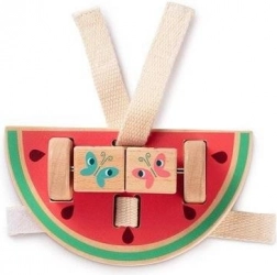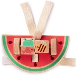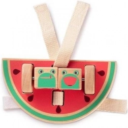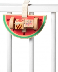 Jucăria colorată în formă de pepene, echipată cu o tijă metalică cu cuburi rotative, oferă distracție și sprijină dezvoltarea motricității fine a copiilor.