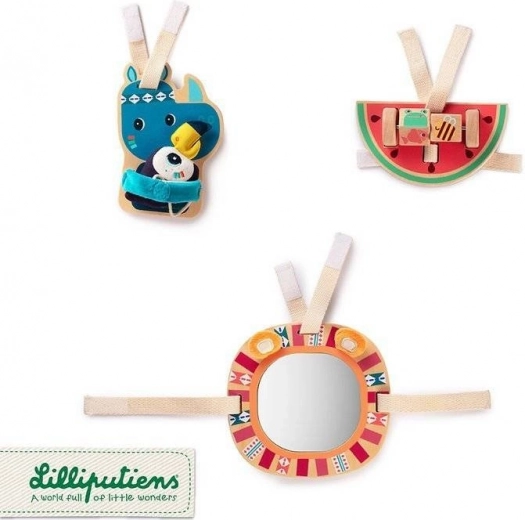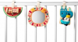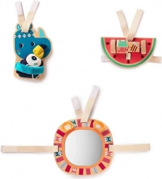 Fiecare jucărie este echipată cu un velcro practic pentru montarea ușoară pe cărucior, scaunul auto sau pătuțul copilului. Aceste jucării ajută la dezvoltarea coordonării mână-ochi și a percepției senzoriale prin atingere, vedere și auz.