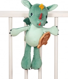 Datorită buclelor practice, dragonul poate fi atașat la pătuț sau cărucior, permițând transportul ușor și utilizarea ca decor.