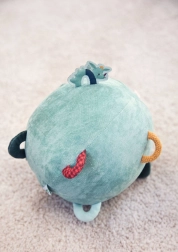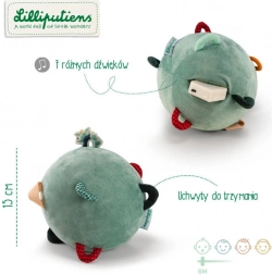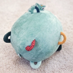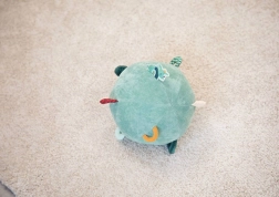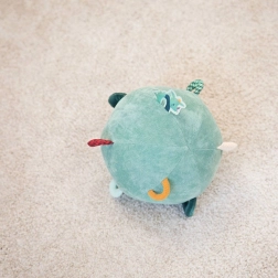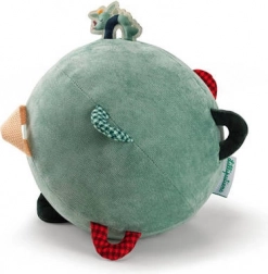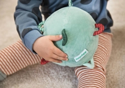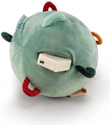 https://www.youtube.com/watch?v=bUrBsQ6LiAE Mingiță senzorială textilă verde cu dragonul Joe. La exterior are mici mânere cusute, datorită cărora poate fi apucată foarte ușor. Copiii sunt atrași să exploreze panglicile cu degețelele, stimulând astfel simțurile și motricitatea fină. În interiorul mingii se află o cutiuță muzicală detașabilă, care redă mai multe sunete muzicale pentru stimularea auzului. Cu ajutorul unui buton de pe mecanism puteți porni sau opri sunetele oricând. Mingița este ușor de manevrat de către copii. Această mingiță este potrivită pentru copii de la 6 luni. Fabricată din 100% poliester. Diametrul mingii este de 15 cm. După îndepărtarea cutiuței muzicale, poate fi spălată la mașină.