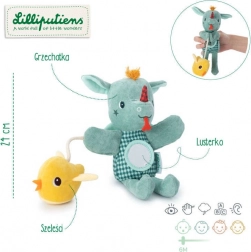 Drăgălașa păpușă de mână din colecția dragonul Joe de la Lilliputiens trezește imaginația și simțurile bebelușilor de la 6 luni. Are orificii pentru degete pentru a prinde viață ușor, un zornăitor ascuns în cap, pe burtică un oglinda moale și pe șnur un puișor fosnitor. Execuția impecabilă, materialele sigure și texturile fine susțin motricitatea fină, coordonarea mână–ochi și percepția sunetului, văzului și atingerii.