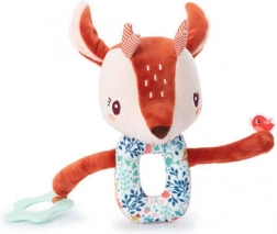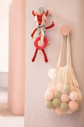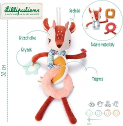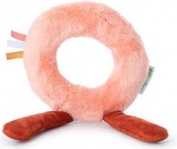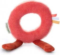 Fiecare element este dintr-o țesătură diferită (de ex. șnur, „frou-frou” pufos și mătăsos), ceea ce susține percepția tactilă. Picioarele lungi, urechiușele, căpușorul și panglicile invită la explorare, strângere, apucare și scuturare. Lanțul se prinde ușor cu ajutorul șnururilor de la căpșor – pe cărucior, în scaunul auto sau în port-bebe. Jucăria este de calitate, sigură și lavabilă la program delicat, până la 30 °C.