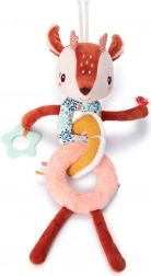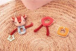 Lanțul activ Căprioara Stella este format din segmente moi, care se conectează printr-un inel magnetic central. În căpșorul căprioarei este ascunsă o zornăitoare, o urechiușă foșnește plăcut, iar pe lăbuță vei găsi o păsărică drăgălașă – un patch senzorial. Cealaltă lăbuță poartă o jucărie de dentiție în formă de steluță, cu proeminențe, pentru alinarea erupției dentare.
