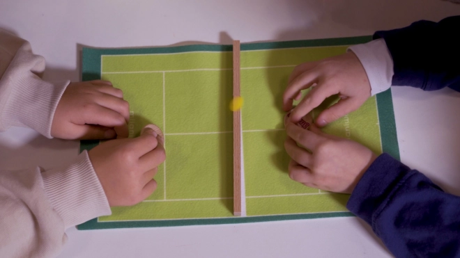 Jocul Skok! Tenis este o distracție grozavă pentru întreaga familie. Mai întâi montați terenul și setați timpul de meci cu un minim de 3 minute. Sarcina jucătorului este să servească discul galben astfel încât să aterizeze în jumătatea adversarului, evitând în același timp crculeta. Jocul este extrem de distractiv și susține gândirea strategică.