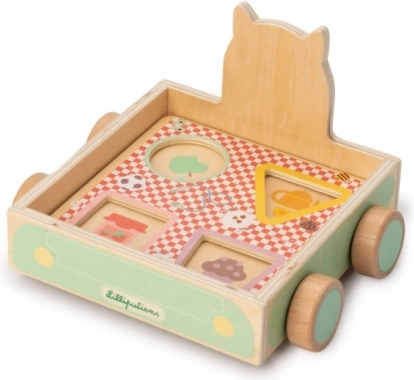Acest cărucior original din lemn, cu motivul lupului Ludovic, oferă copiilor de la 10–12 luni o mulțime de activități într-un singur produs. Copilul poate trage jucăria, introduce formele în deschiderile potrivite și poate descoperi diverse personaje și culori. Combinația dintre lemn și elemente textile moi oferă stimuli tactili plăcuți și un joc sigur.