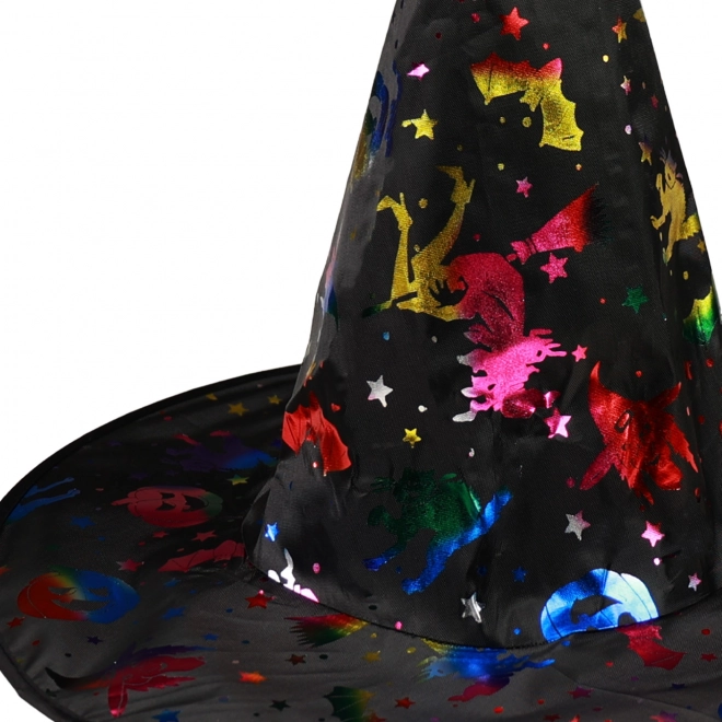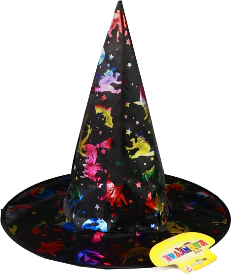 Pregătiți-vă pentru Halloween sau petrecerile tematice cu această pălărie de vrăjitoare. Pălăria este neagră cu modele holografice care reprezintă lilieci și stele, ideală pentru oricine dorește să arate deosebit.