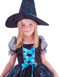 Acest costum magic de vrăjitoare, mărimea S, este destinat copiilor de circa 4–6 ani (înălțime 105–116 cm). Combinația de negru și albastru intens cu motiv stelar creează un aspect de efect pe care micile vrăjitoare îl vor îndrăgi. Include și o pălărie ascuțită asortată cu rochia.