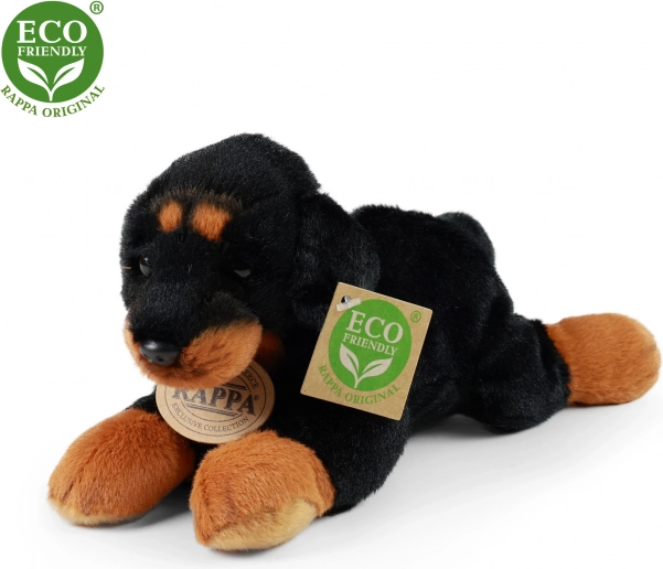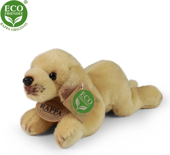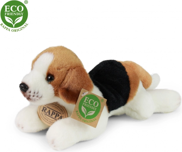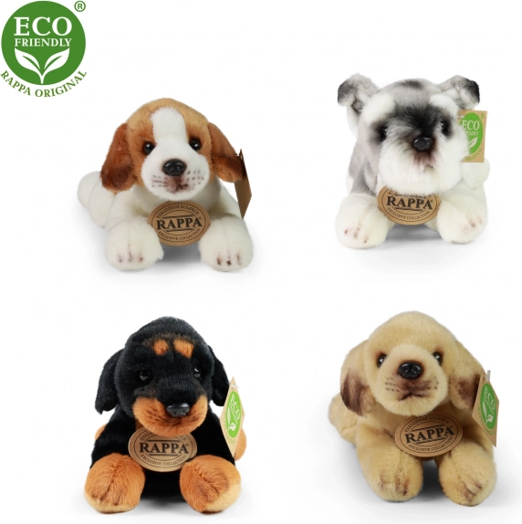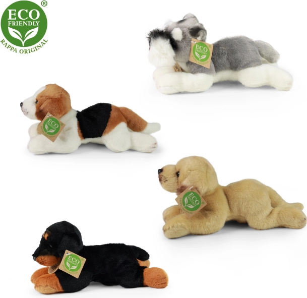 Câine de pluș culcat cu dimensiunea de 16 cm, disponibil în diferite rase, cum ar fi beagle, brac, labrador sau rottweiler. Fabricat din materiale ecologice, care îndeplinesc toate standardele de siguranță.