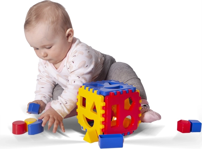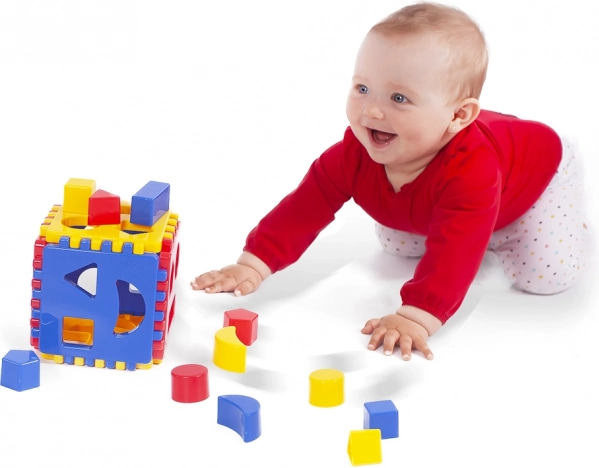 Acest cub de sortare colorat este o jucărie excelentă pentru bebeluși și toddleri. Copiii explorează diferite forme geometrice, învață să le asocieze corect și își exersează coordonarea mână–ochi. Datorită culorilor vii, stimulează curiozitatea și susține învățarea naturală prin joc.