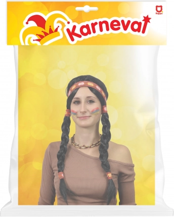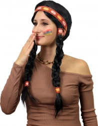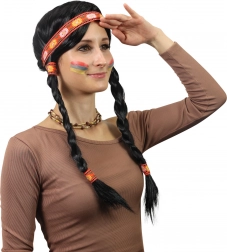 Perucă de carnaval stilată, cu două codițe împletite și o bentiță decorativă, oferă costumei tău o notă autentică de stil indian. Datorită codițelor lungi negre, bentiței decorative și confortului la purtare, este ideală pentru carnaval, petreceri tematice și cosplay. Culoarea panglicilor poate varia.