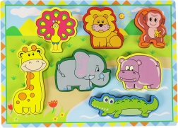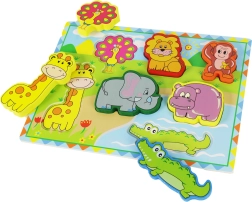 Puzzle 3D din lemn cu motive de animale de safari este ideal pentru dezvoltarea abilităților motorii ale copiilor prin inserarea distractivă a formelor.