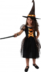 Costumul negru cu panglici portocalii și stele metalice oferă un aspect stilat pentru fiecare mică vrăjitoare.