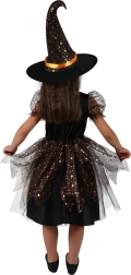 Rochia este bogat ornamentată cu elemente portocalii și stele metalice, care atrag privirile din prima clipă. Costumul include, de asemenea, o pălărie de vrăjitoare, ceea ce oferă întregului set un aspect autentic.