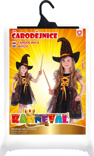 Rochia este bogat ornamentată cu elemente portocalii și stele metalice, care atrag privirile din prima clipă. Costumul include, de asemenea, o pălărie de vrăjitoare, ceea ce oferă întregului set un aspect autentic.
