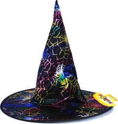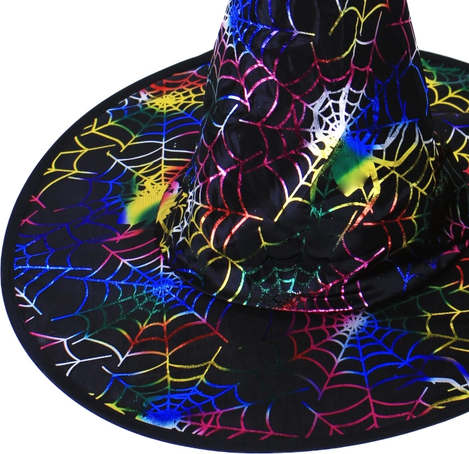 Adaugă o notă unică costumului tău de Halloween sau de carnaval cu eleganta pălărie neagră de vrăjitoare decorată cu pânze de păianjen colorate. Materialul ușor și maleabil este confortabil de purtat, în timp ce borul larg și vârful conic creează o siluetă iconică.