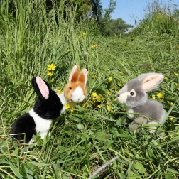Alege dintre variantele gri, alb-negru sau maro-alb. Fiecare iepuraș este un companion pufos pentru joacă și adormit.