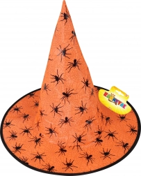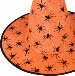 Intră în lumea magiei cu o pălărie de vrăjitoare remarcabilă, într-o nuanță intensă de portocaliu. Forma conică, borul larg și detaliile negre contrastante cu motive de pânze de păianjen și păianjeni oferă costumului tău acel aer înfricoșător autentic.