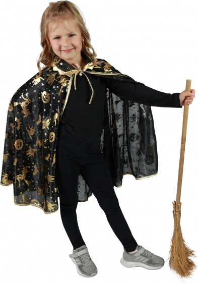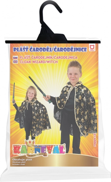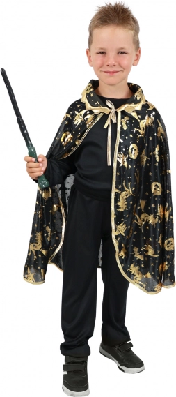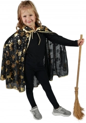 Pelerina vrăjitorească neagră pentru copii, cu imprimeu auriu cu stele, luni și alte motive, transformă instant orice copil într-un mic magician. Este ușoară, plăcută la purtare și se îmbracă ușor datorită legării la gât.