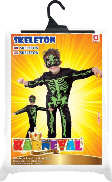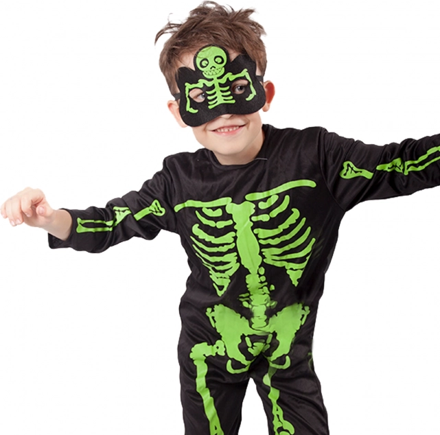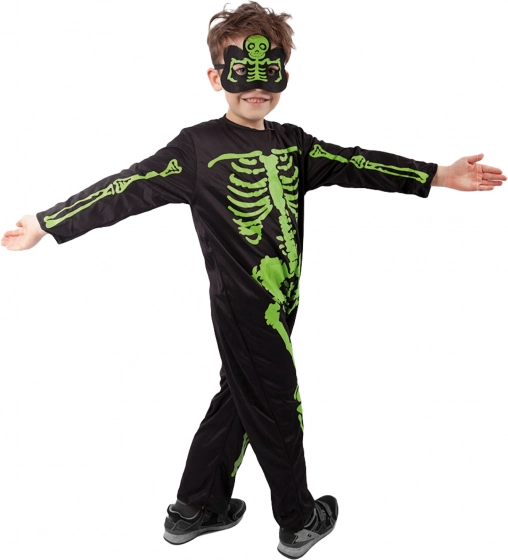 Costum stilat pentru copii, schelet, cu oase verde neon evidențiate pe fundal negru. Ideal pentru Halloween, carnaval și petreceri tematice. Include salopetă și mască pentru un aspect complet înspăimântător. Material confortabil, îmbrăcare ușoară și imprimare neon de efect pentru multă distracție și atenție.