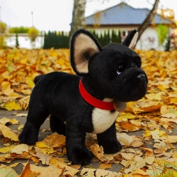 Acest bulldog francez negru cu zgardă roșie se remarcă prin trăsături detaliate și o suprafață foarte moale, care te invită la îmbrățișări. Datorită prelucrării manuale, arată foarte realist și va deveni un companion îndrăgit al copiilor încă din primele luni.