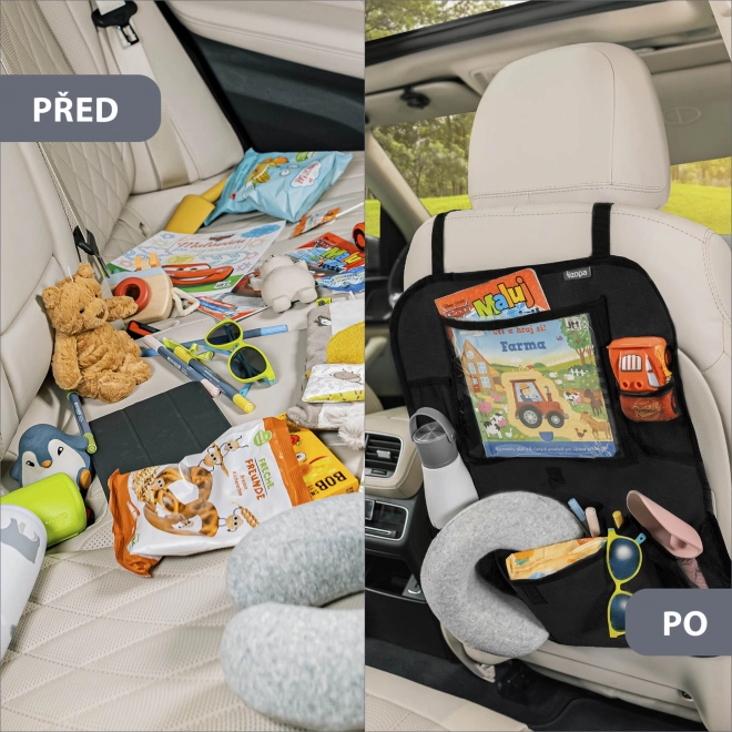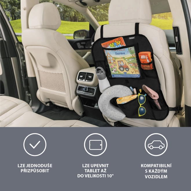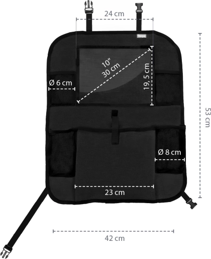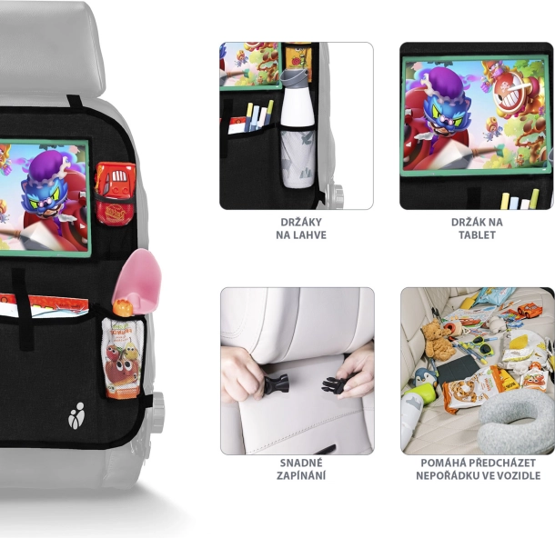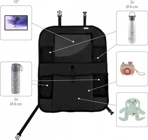 Organizator practic pentru spătar, cu buzunar pentru tabletă, este însoțitorul perfect pentru fiecare călătorie cu copiii.