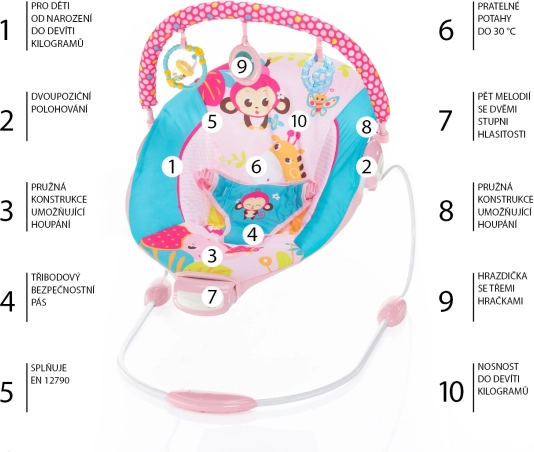 Leagănul pentru copii Happy Safari Pink va încânta copiii cu designul său colorat și funcțiile care contribuie la stimularea și relaxarea lor. Leagănul este destinat copiilor de la naștere până la 9 kg și oferă o gamă largă de funcții pentru calmare și distracție.