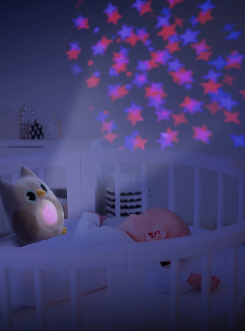 Plușul Bufniță poate proiecta un cer înstelat colorat pe plafonul camerei copilului, creând o atmosferă calmă pentru un somn mai ușor.