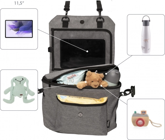 Include un buzunar extra mare cu fermoar și un buzunar frontal mai mic. De asemenea, are un suport pentru tabletă de 11,5", datorită căruia îi veți distra pe copii chiar și pe trasee mai lungi.