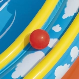 Centrul de joacă include bile colorate și un jgheab pentru rostogolirea lor, care susțin motricitatea și imaginația copiilor în timpul jocului.