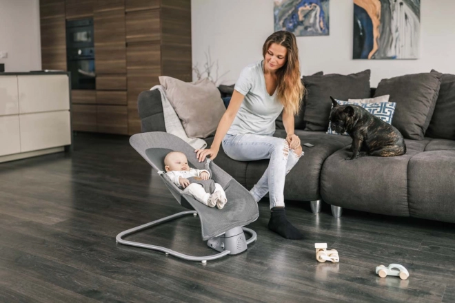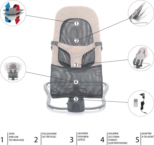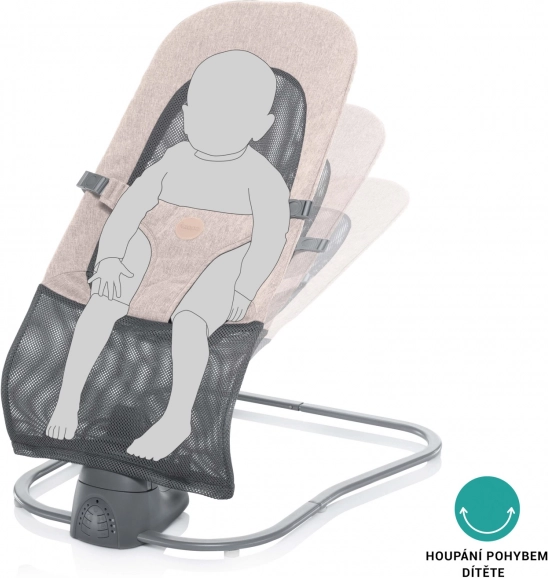 Spătarul este reglabil în 3 poziții, în funcție de faptul dacă bebelușul dorește să observe lumea din jur sau mai degrabă să ațipească. Sistemul de legănare este asigurat în două moduri – primul este independent de energia electrică, când leagănul se pune în mișcare prin mișcările copilului, iar al doilea este cu ajutorul motorului electric, care leagănă scaunul lateral. Legănarea electrică are 5 niveluri de intensitate, care pot fi alese liber în funcție de ceea ce îi este cel mai plăcut copilului. Alimentarea se face cu adaptor, care este inclus în pachet. Leagănul are și sloturi pentru baterii AAA, astfel încât îl puteți lua cu dvs. în călătorii și acolo unde nu există acces la rețeaua electrică. Este inclus și un temporizator cu intervale de 8, 15 și 30 de minute. O funcție utilă este pornirea automată, care se activează imediat ce leagănul detectează mișcarea copilului. Toate funcțiile pot fi controlate prin panoul din partea frontală sau se poate folosi telecomanda inclusă în pachet.