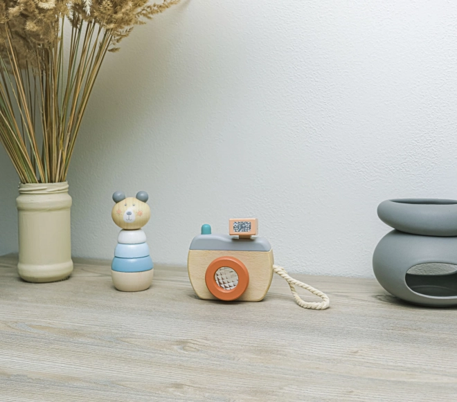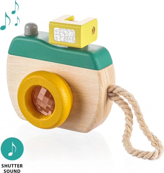 Aparat foto din lemn pentru copii, susține creativitatea și motricitatea, ușor de transportat cu sunet realist.