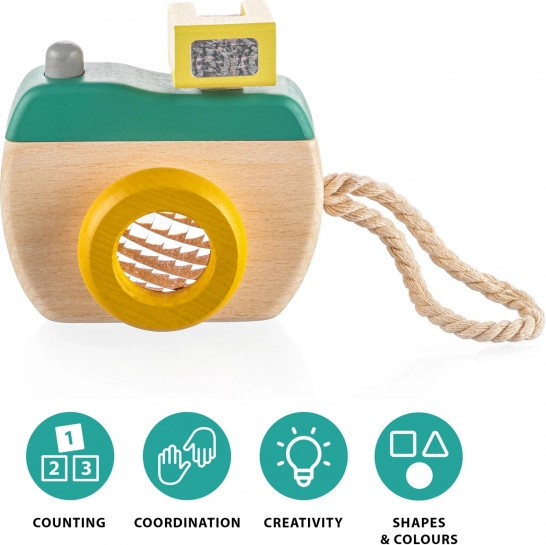 Aparatul foto din lemn este ideal pentru micii creativi. Designul compact și ușor permite manipularea și transportul facil.